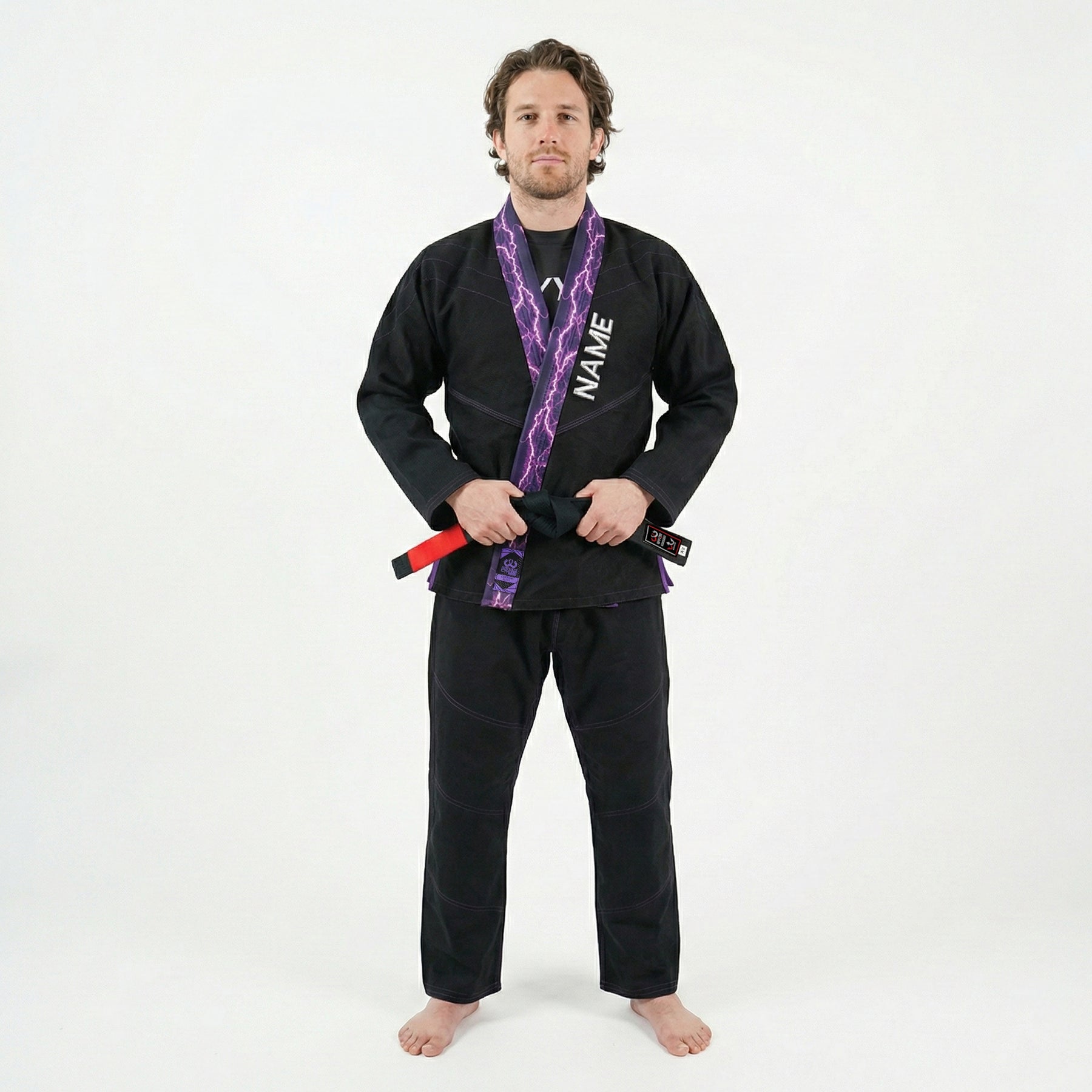 Fabric: 90% pre-shrunk material for lasting comfort and precision fit. Jacket: 450 GSM pearl weave cotton for durability and breathability. Pants: 10 oz ripstop cotton for strength and mobility. Customization:Custom name embroidered on the front, large logo on the back, and custom inner rash guard lining featuring your chosen design or branding. Design: Sleek black body with a bold thunder purple lapel for a powerful, professional edge. Performance: Built for comfort, strength, and personalized team or individual identity.