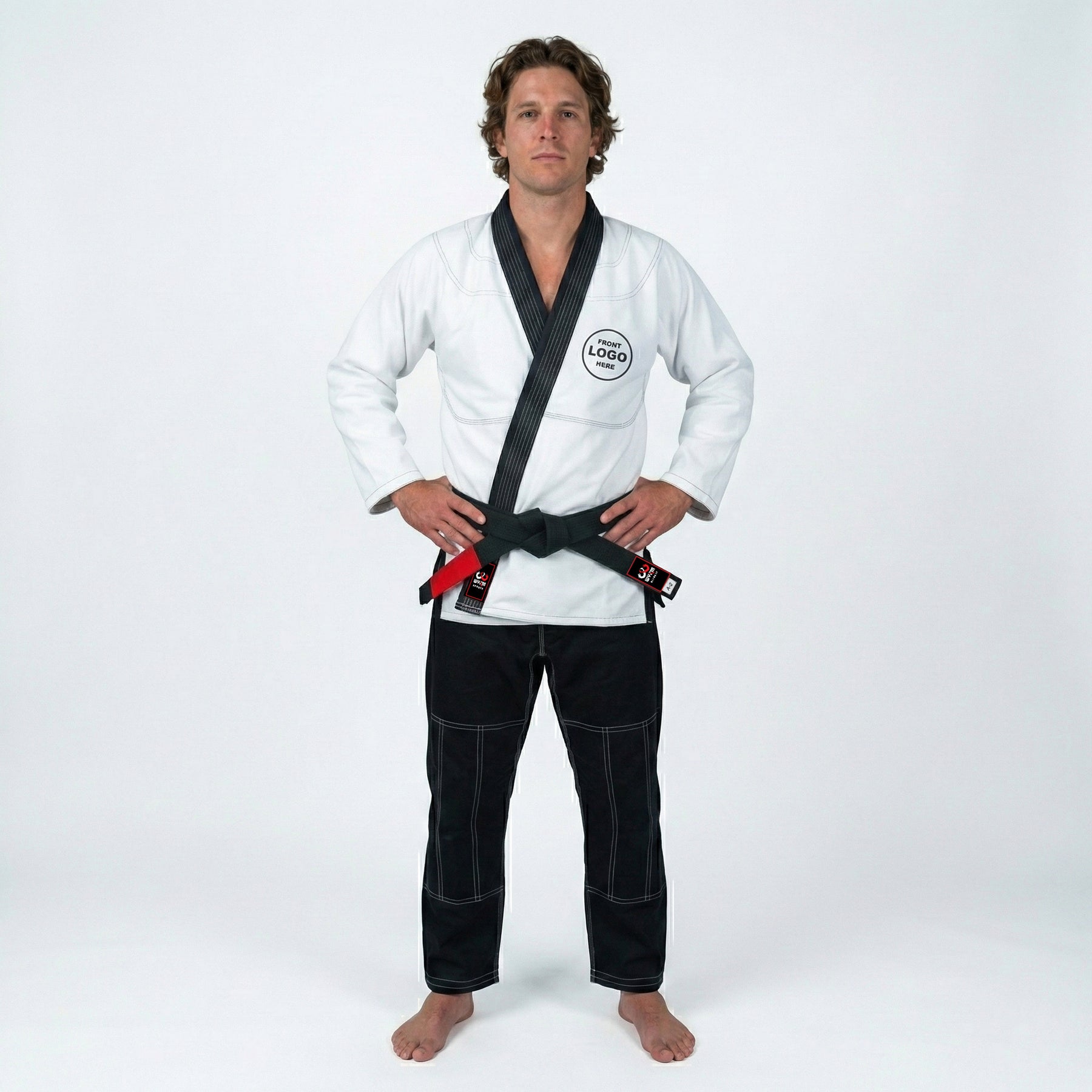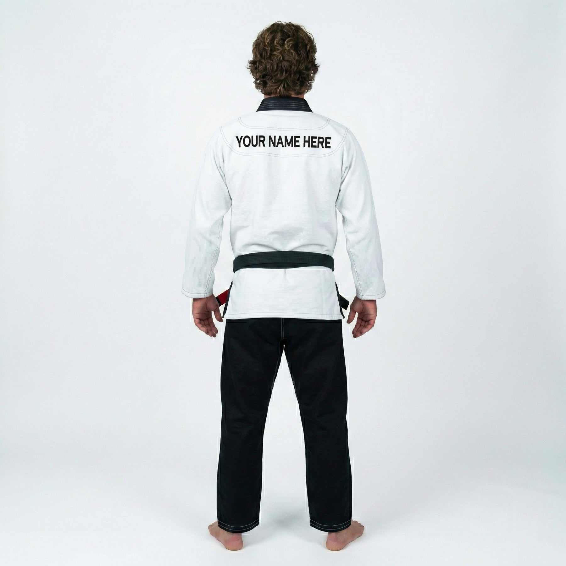 Fabric: Made of 90% pre-shrunk material for a consistent, long-lasting fit. Jacket: 450 GSM pearl weave cotton for durability and comfort. Pants: 10 oz ripstop cotton for flexibility and resilience during training. Customization:Custom name boldly imprinted on the left alongside the lapel and custom logo fully embroidered on the rear side for a clean, professional finish. Design: Crisp white body contrasted with a black lapel for a modern, high-impact look. Performance: Tough, breathable, and personalized—perfect for gyms, clubs, and athletes who value both function and style.