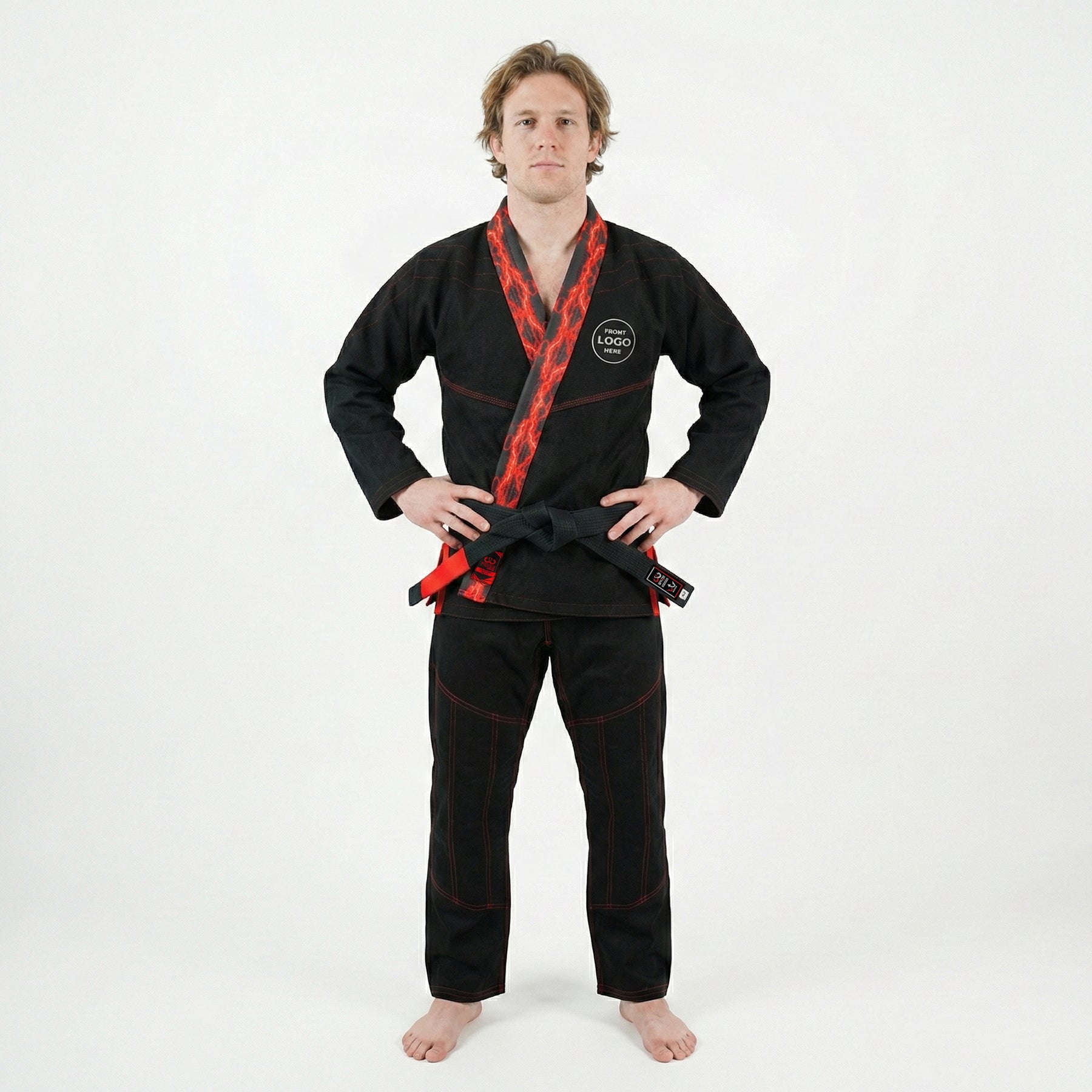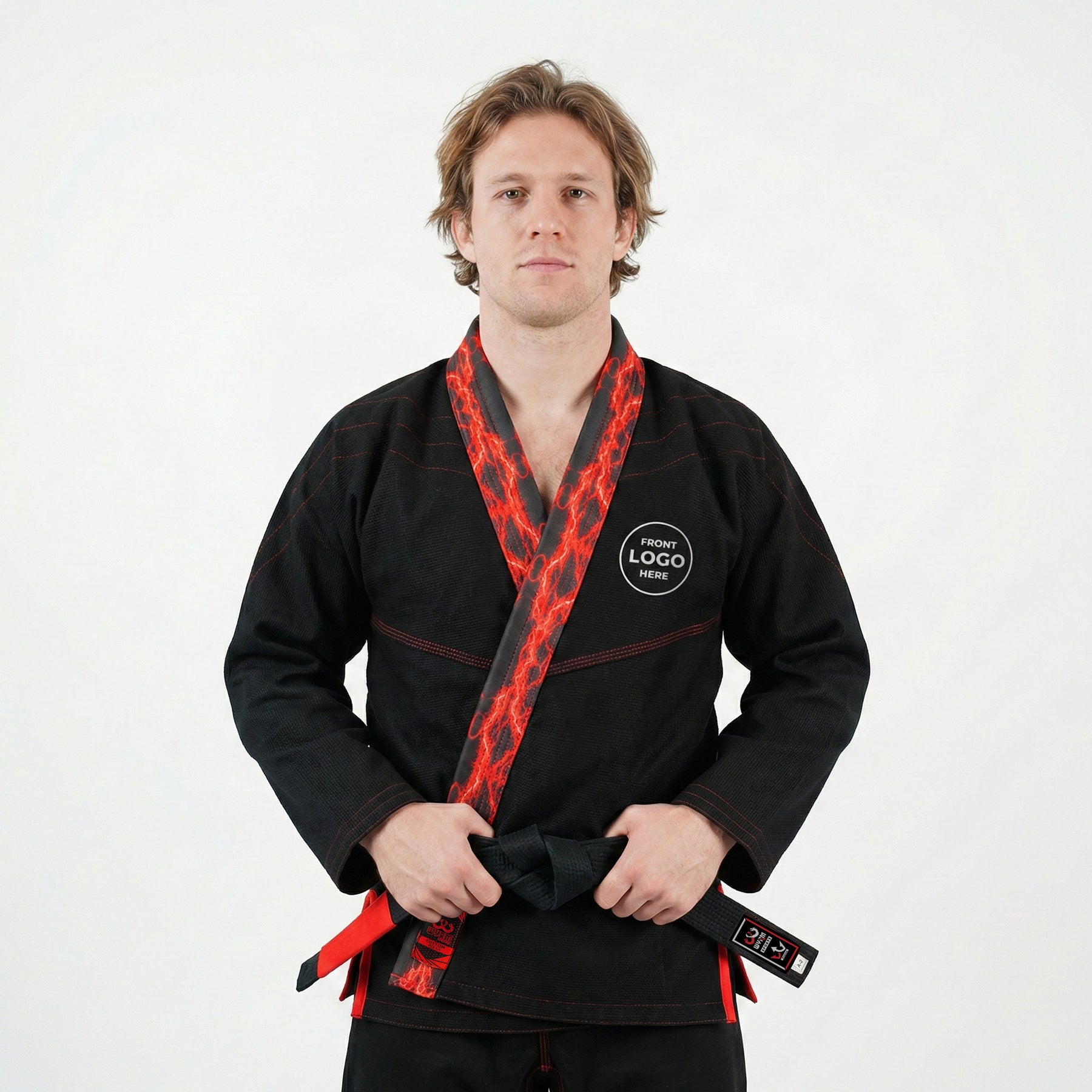 The Premium Custom Black with Thunder Red Lapel BJJ Gi delivers a fierce look with full personalization. Built for athletes and academies that value strength, comfort, and individuality, it combines premium materials with powerful custom detailing.