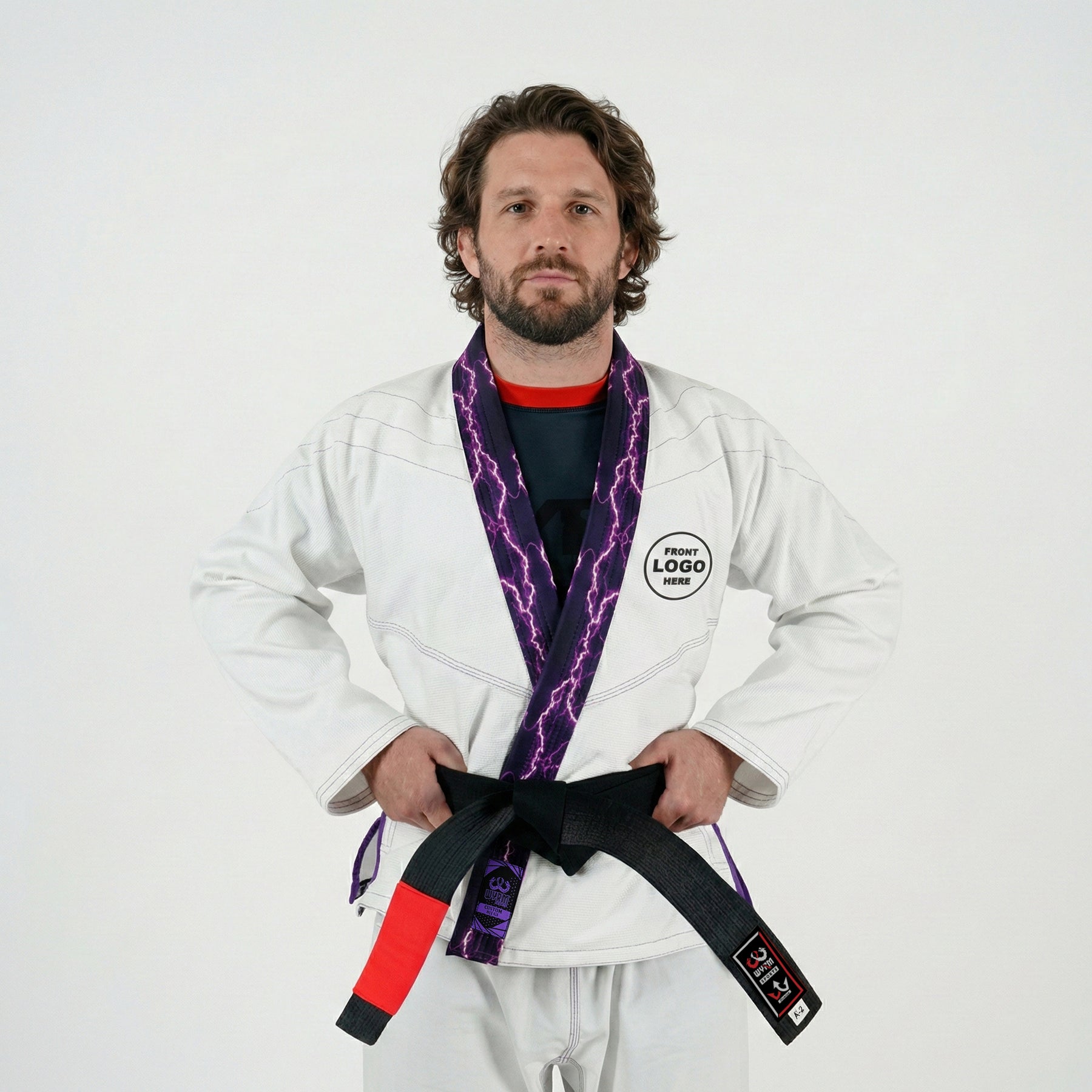Fabric: Made of 90% pre-shrunk material for a consistent, long-lasting fit. Jacket: 450 GSM pearl weave cotton providing strength and breathability. Pants: 10 oz ripstop cotton ensuring flexibility and ease of movement. Customization:Custom name embroidered on the back, custom logo on the left chest, and custom inner rash guard lining displaying your unique design or branding. Design: Crisp white gi accented with a vivid Thunder Purple lapel for a modern, eye-catching look. Performance: Durable, breathable, and fully customizable—perfect for athletes and teams who train with pride and style.