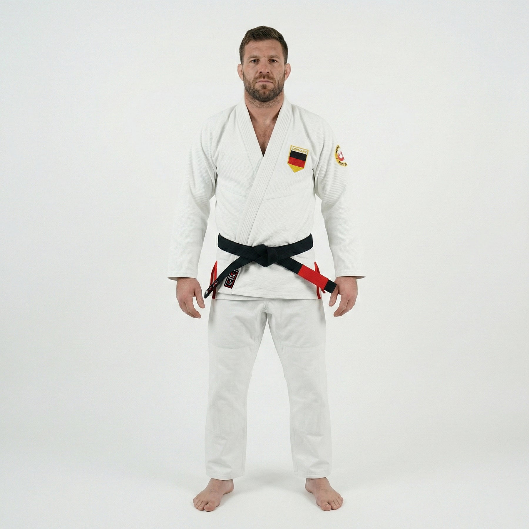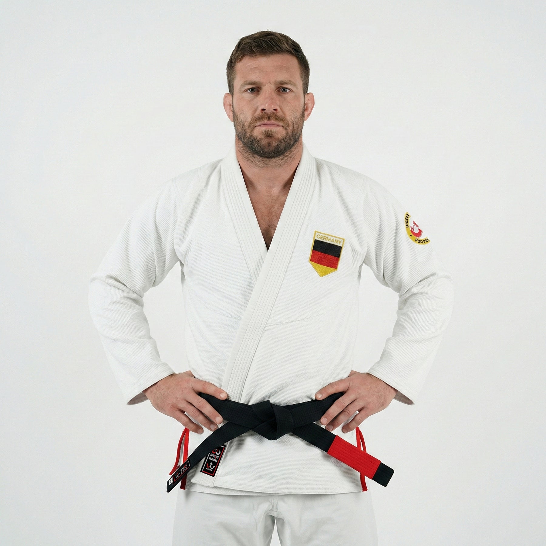 Fabric: Made of 90% pre-shrunk material for a secure, long-lasting fit. Jacket: 400 GSM pearl weave cotton with German flag sublimated rashguard interior. Pants: 10 oz ripstop cotton for strength and unrestricted movement. Design: Crisp white exterior with a German flag patch on the left chest for a bold, national touch. Performance: Lightweight, breathable, and ideal for practitioners who roll with focus and pride.